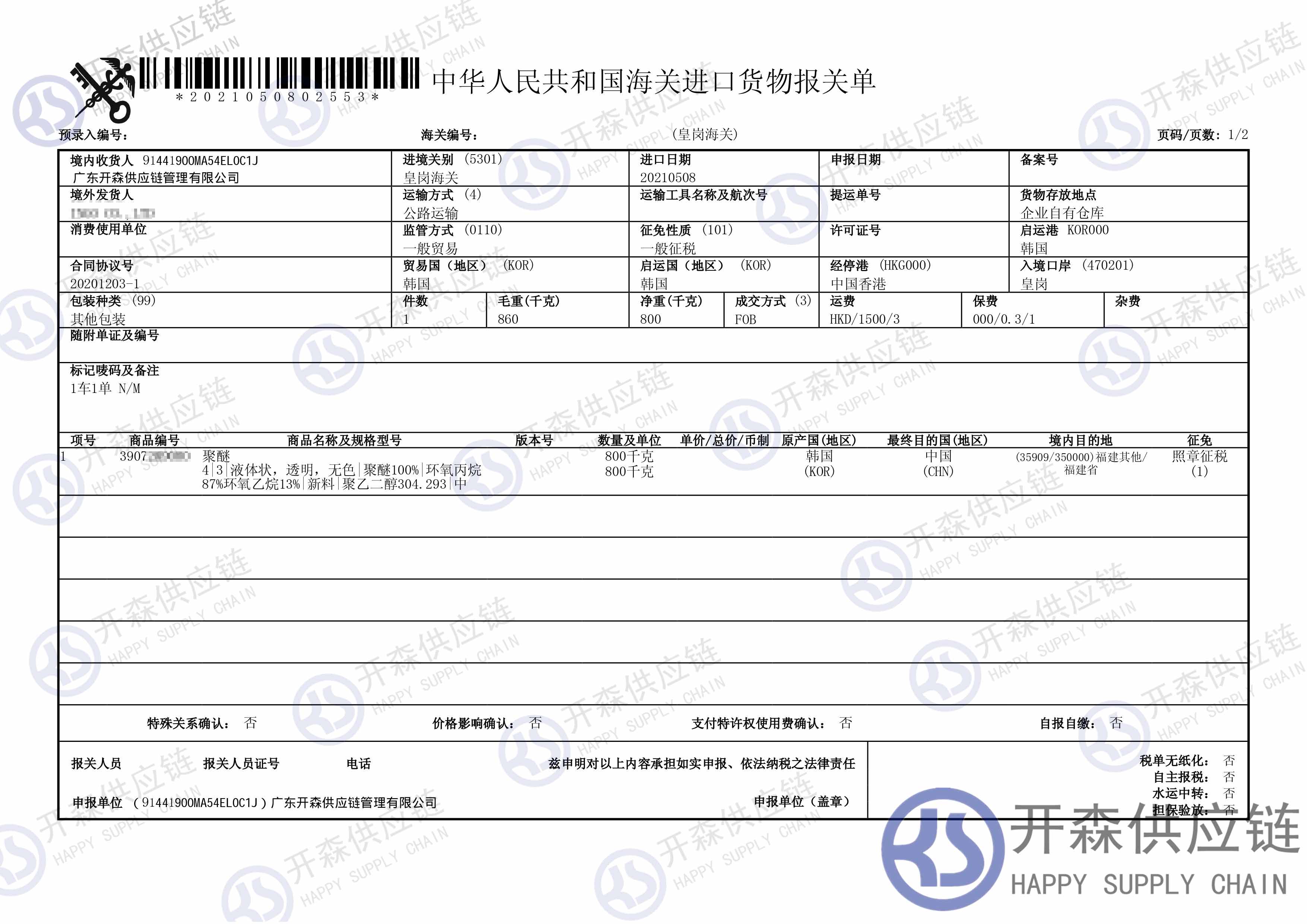 從韓國(guó)進(jìn)口一批聚醚等到深圳皇崗碼頭,我司提供門(mén)到門(mén)進(jìn)口一站式清關(guān)服務(wù),開(kāi)森擁有十余年化工品進(jìn)口清關(guān)經(jīng)驗(yàn)及案例,為客戶提供量身制作的進(jìn)口方案,讓客戶進(jìn)口省時(shí)省心省成本。